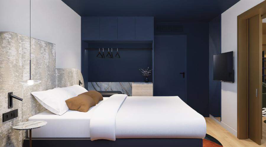 Het vernieuwde interieur is ontworpen door designstudio HD+VK. Daarbij is inspiratie gehaald uit het iconische blauwe gebouw zelf: patronen uit het gebouw keren terug in elementen zoals de vloerafwerking en de headboards. Volgens het hotel ontstaat zo "een dynamisch geheel" door de combinatie van "uitgesproken kleuren, zorgvuldig gekozen materialen en kunstwerken".