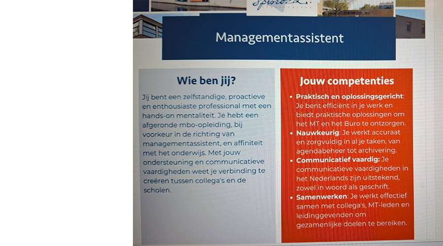Als gedreven en proactieve managementassistent bij Scholengroep Spinoza lever je een indirecte maar onmisbare bijdrage aan de onderwijskwaliteit voor duizenden leerlingen. Meer informatie is te vinden via deze link: https://lnkd.in/e72qn8vg