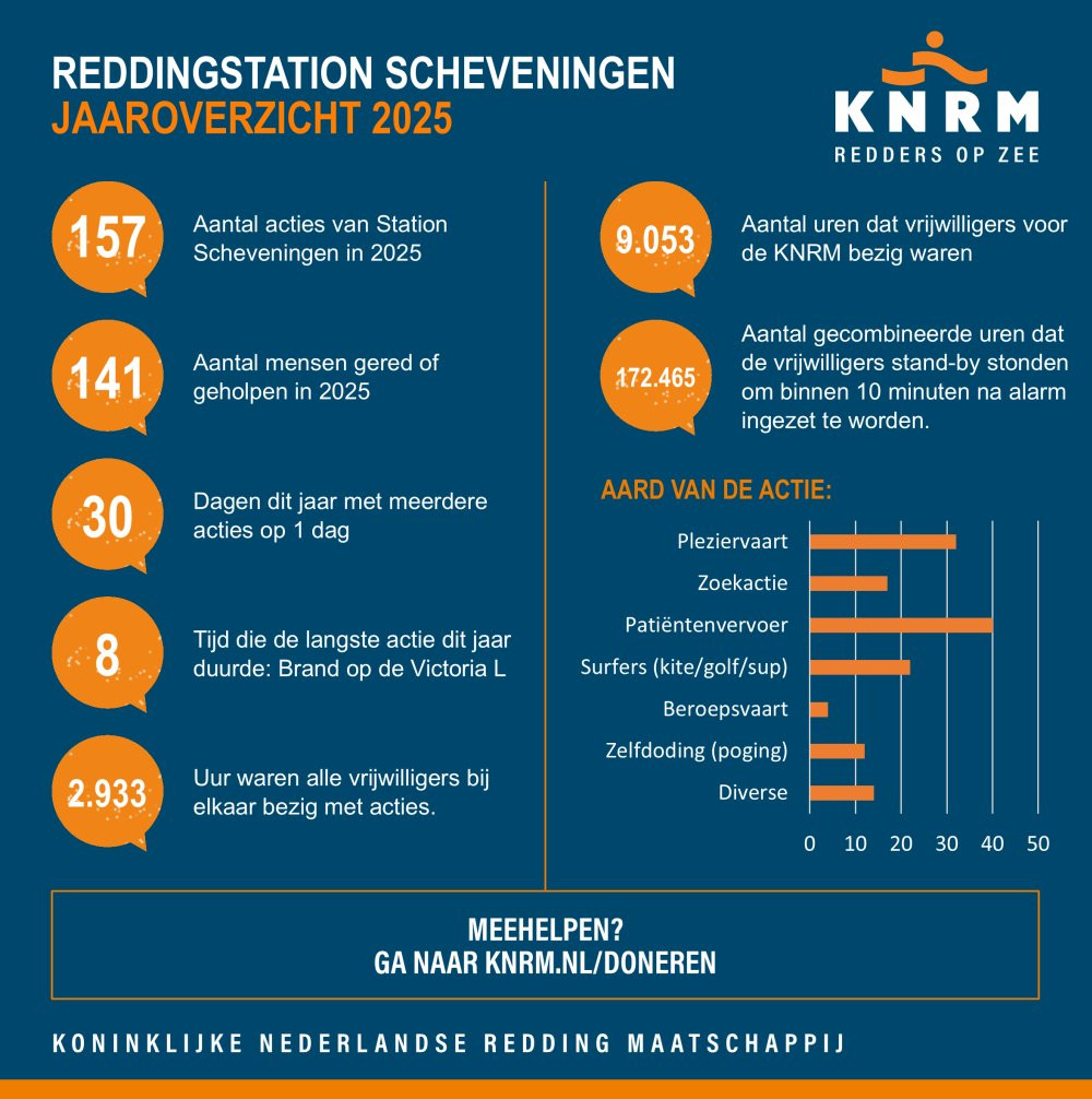 Het jaar 2025 was voor het Scheveningse station van de Koninklijke Nederlandse Redding Maatschappij (KNRM) een intensief en bijzonder jaar. In totaal werd het station 157 keer opgeroepen voor hulp- en reddingsacties. Daarnaast werd in 2025 een belangrijke mijlpaal bereikt met de komst van de nieuwe reddingboot Jaap Pronk.