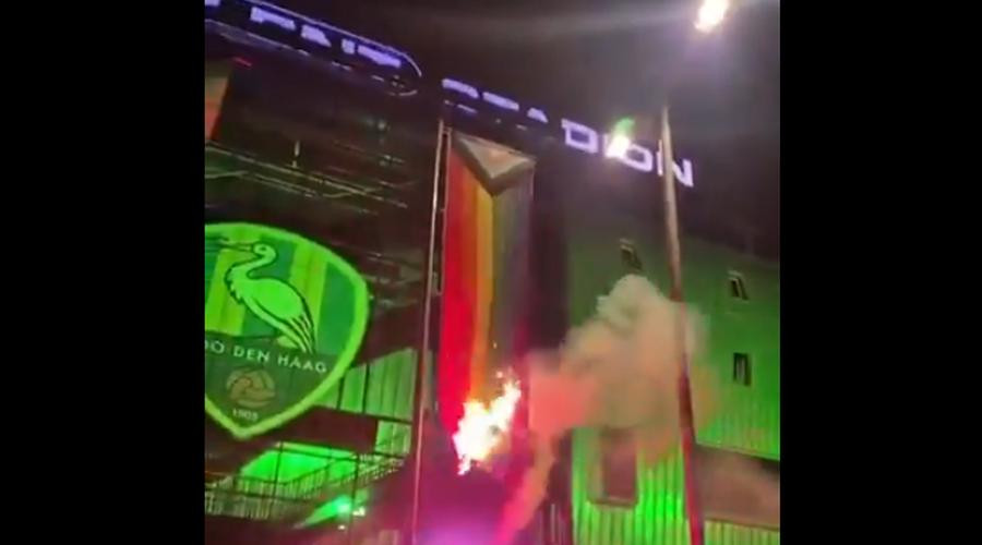 Op social media is een filmpje te zien van een onbekend persoon die met een fakkel de banier in brand steekt. Het filmpje werd afgelopen zondag geplaatst op het berichtenplatform X, maar het is onduidelijk wanneer en door wie de pride vlag in brand werd gestoken. Volgens de tekst bij het filmpje zou het gaan om "Den Haag fans".
