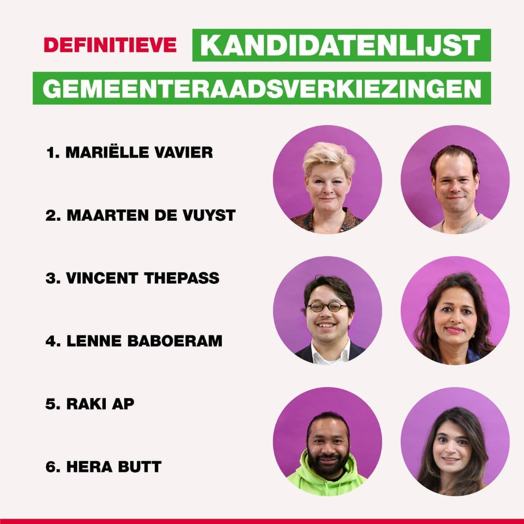 Na lijsttrekker Mariëlle Vavier en De Vuyst op twee, bestaat de top-5 van GroenLinks verder uit voormalig fractiemedewerker en campagneleider Vincent Thepass (3), arbeidsdeskundige Lenne Baboeram (4) en de voormalige vluchteling Raki Ap (5). GroenLinks zit op dit moment met vijf mensen in de gemeenteraad.